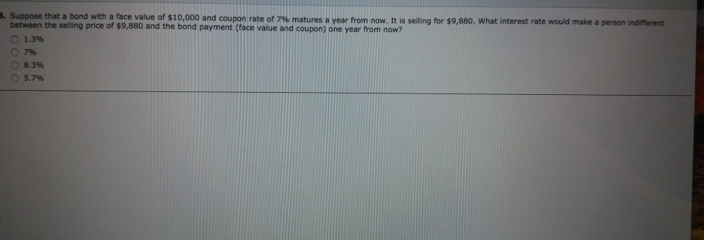 Question 23 A risk free zero coupon bond with a 5000 face value has ten ... View full document. Question 23 A risk-free, zero-coupon bond with a $5000 face value has ten years to maturity. The bond currently trades at $3650. What is the yield to maturity of this bond? A. 3.465% B. 3.699% C. 3.197% D. 3.284%. Exam 2-Sample Exam 11 Question 24 You are interested in purchasing a new automobile that costs $35,000.