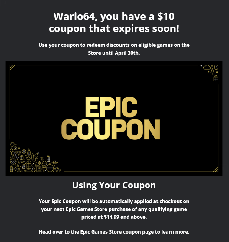 Connect and Save! Subscribe to Epic Games Emails and get a $10 Epic Coupon 1.27.2022. Connect and Save is back! We're once again offering a $10 Epic Coupon (or local equivalent) for signing up to the Epic Games email and alerts program. If you subscribe between January 27 and February 27, not only will you get the latest info on new releases, free game drops and discounts, but we'll gift you a coupon to be used ...